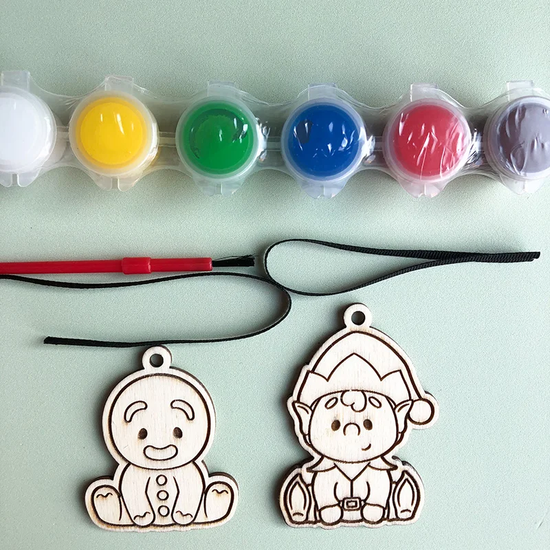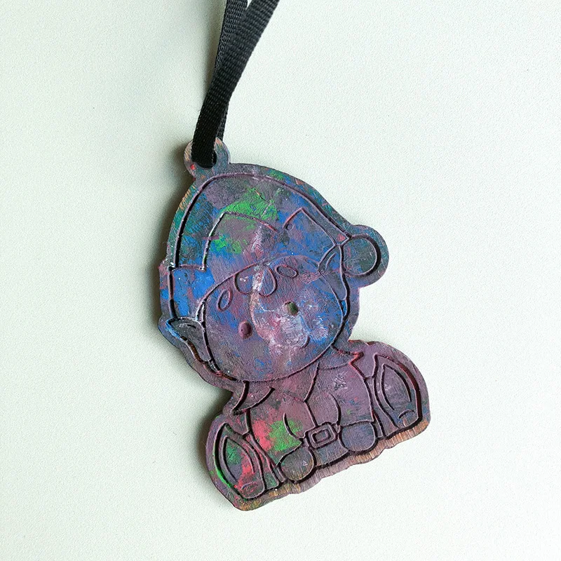 - 2 plywood ornaments with deep engraved designs of Santa and a reindeer or an elf and gingerbread man